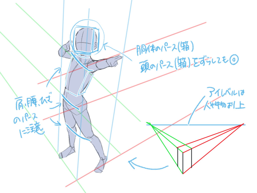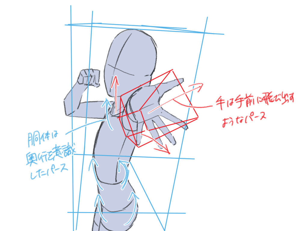胴体は奥に向かうようなパース、そして腕は手前に向かって勢いよく飛び出してくるようなパースを意識して描くのがコツです。