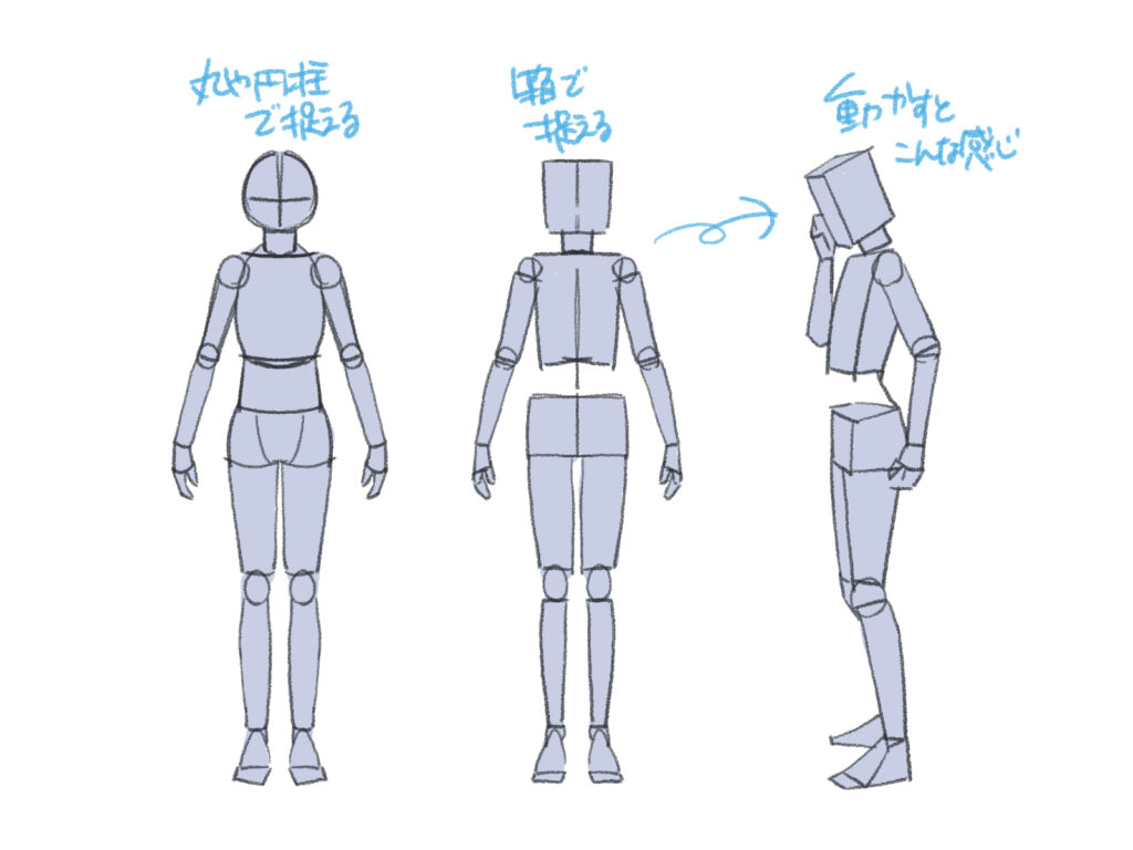 さらに、「胴体の箱」と「頭の箱」の向きを少しずらして描くと、ポーズに動きが出て、より生き生きとした印象になります。