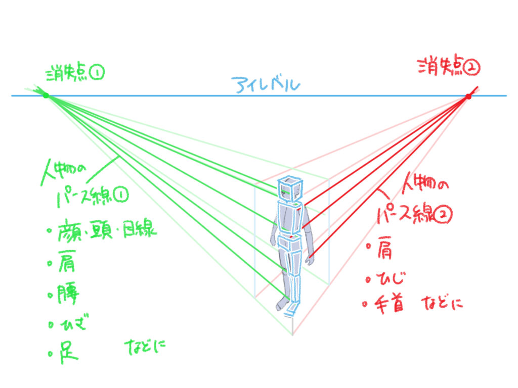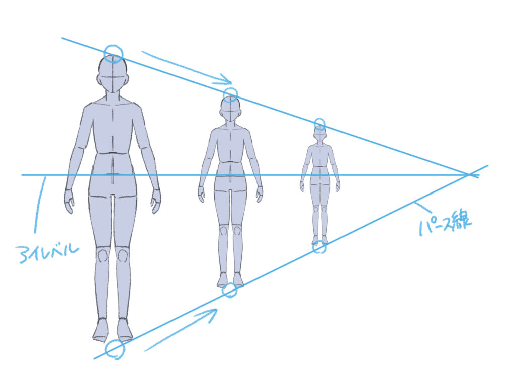 これらの箇所は、体の向きや傾きが分かりやすい部分です。これらのパーツをパース線に乗せることを意識することで、人体の自然なパースが捉えやすくなります。