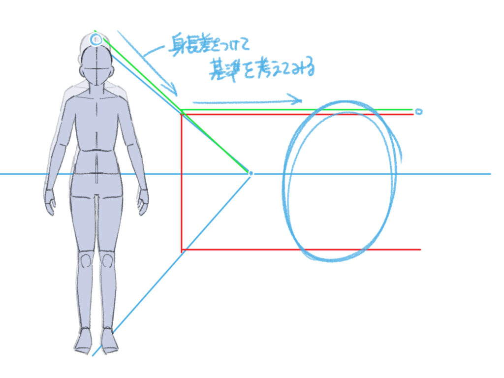 別のキャラクターを描きたい位置に地面から垂直な線を引き、先ほどのパース線と交差した点を探します。その交差した上が頭、下が足となり、その位置に立つキャラクターの正確な高さが決まります。