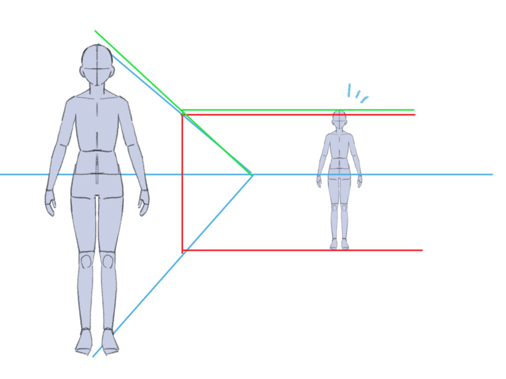 そして、その基準キャラクターの頭の高さと足元から、それぞれ消失点に向かってパース線を2本引きます。この2本の線は、同じ身長のキャラクターが立つことができる範囲を示すガイドラインになります。