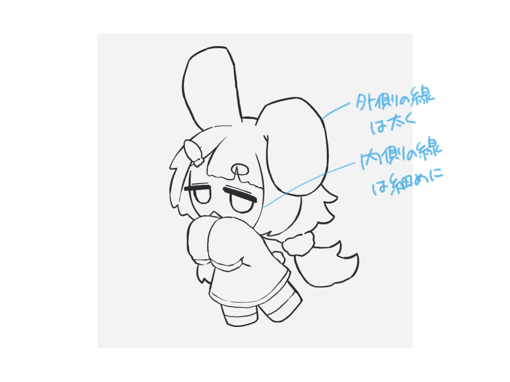 線の強弱でメリハリをつけるのがオススメです。キャラクターの外側の線は太く、服のシワや髪の毛といった内側の線は細めに描くと、立体感が出ます。 もちろん、デザインによっては、あえて全ての線を同じ太さで描き、平面的で可愛らしい雰囲気を出すのも良いでしょう。