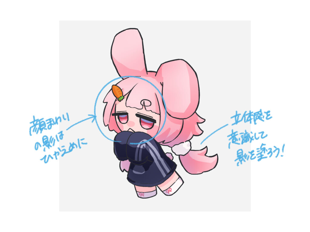 次に影を塗って立体感を出します。2頭身キャラクターは顔が最も目立つパーツなので、顔周りの影は控えめにして、表情が見やすいようにしましょう。身体や服の影は、全体の立体感を意識して大きく捉えて塗っていきます。