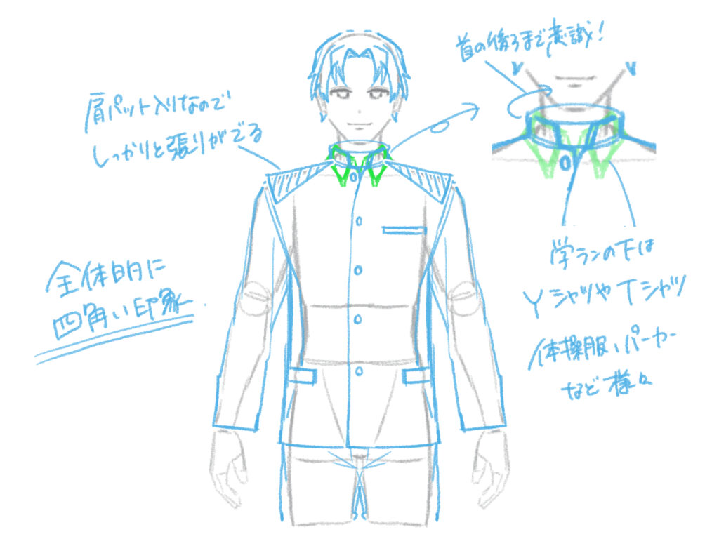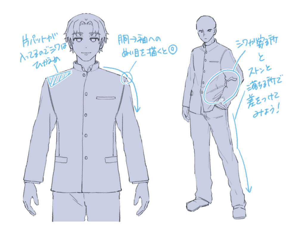 学ランのシワは、入れる場所と入れない場所でメリハリをつけるのがコツです。 肩周りは肩パッドが入っているのでシワを控えめにし、肘や脇腹など、関節が曲がる部分にはシワを多めに描きましょう。胴体から袖への縫い目を意識すると、より学ランらしくなります。