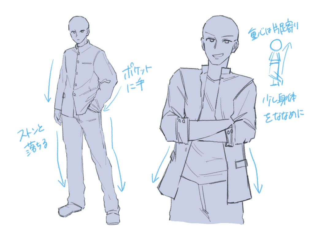 体を少し斜めに傾け、重心が片足に寄るように描くと、少しやんちゃな学生らしい雰囲気を演出できます。