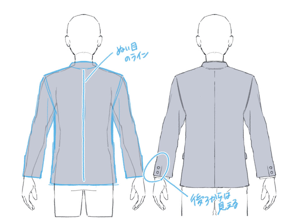 学ランの後ろ姿はとてもシンプルです。詰襟の形に気をつけつつ、全体の形を描きましょう。袖口のボタンや、背中の中心にある縫い目を忘れずに描くことで、後ろ姿でもしっかりと学ランだと分かります。