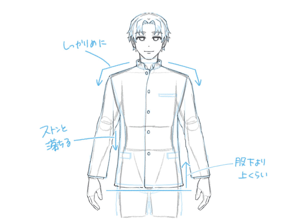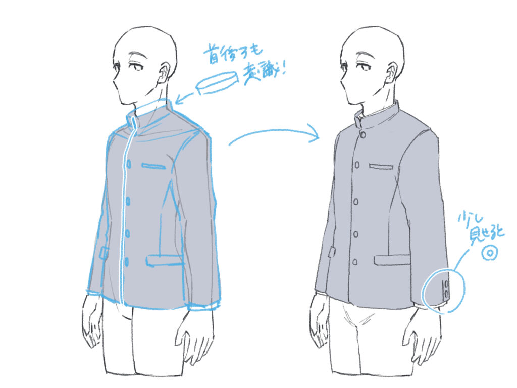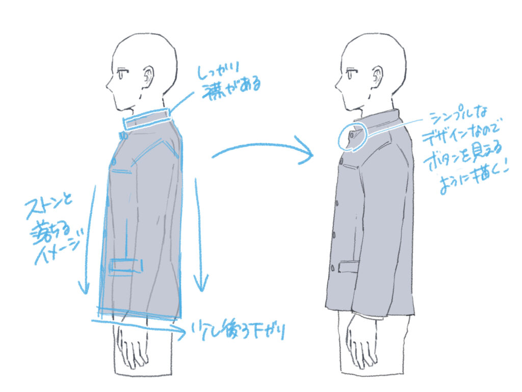 横から描く際は、襟の立体感をしっかり意識し、裾は少し後ろ下がりに描きます。生地の厚みにもよりますが、基本的にはストンと落ちるシルエットを意識しましょう。ボタンが少し見えるように描くと、学生らしさが出ます。