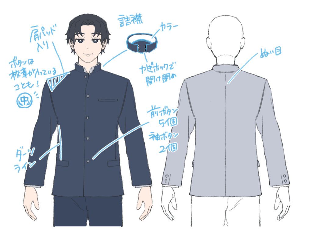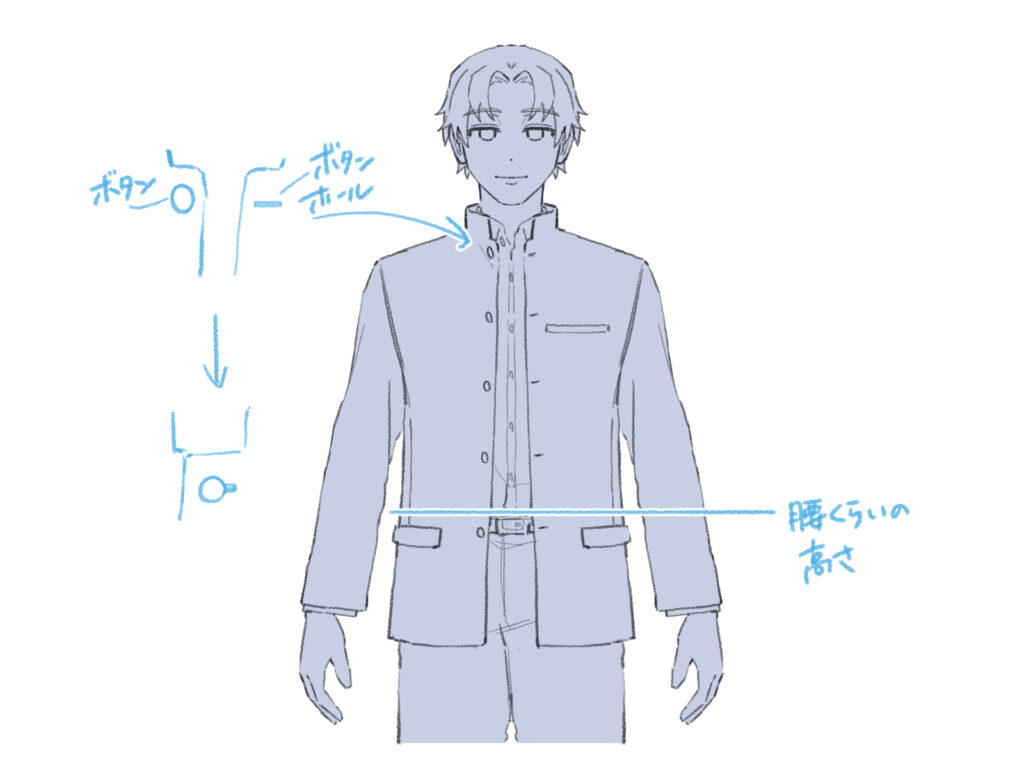 まずは、イラストを描く上で知っておきたい、学ランの基本的な特徴を見ていきましょう。その他の制服の描き方については、初心者も簡単!制服のイラストの描き方の記事を参考にしてください。