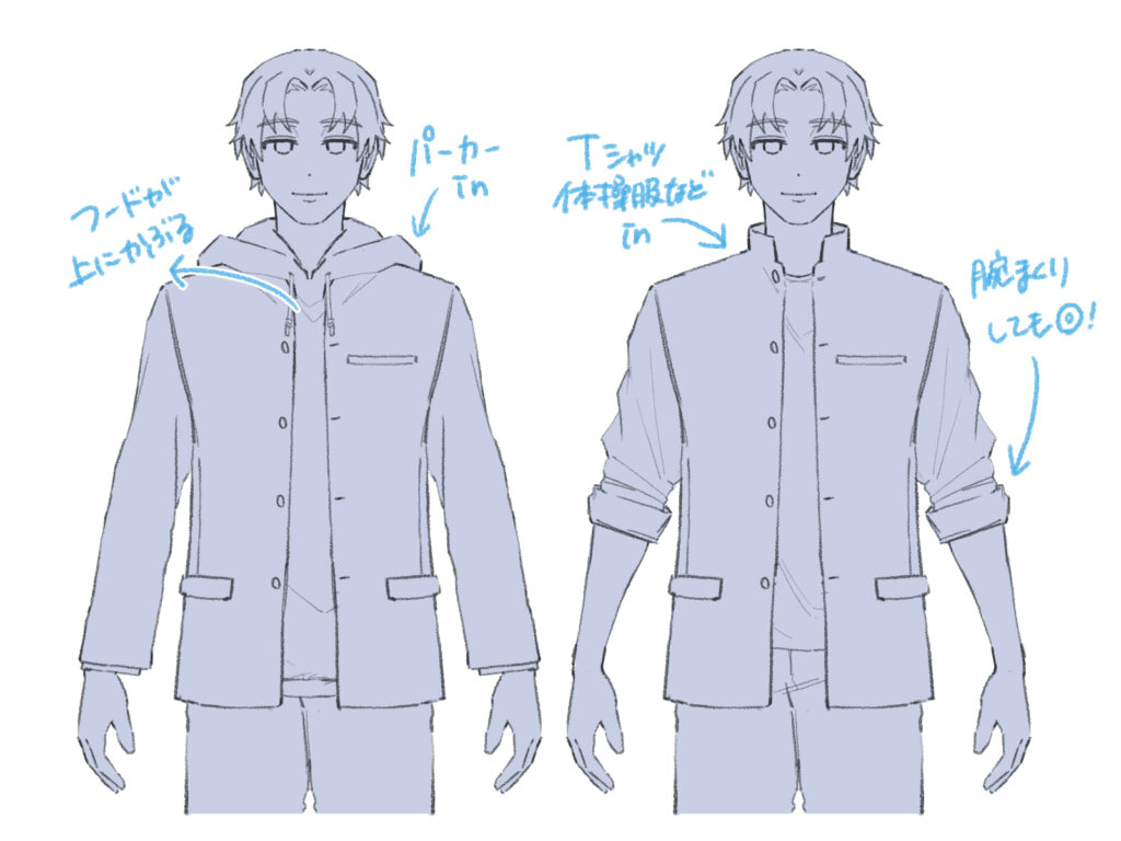 ボタンは向かって左側、ボタンホールは右側になるように描きます。前を開けることで、中に着ているシャツやズボンが見え、キャラクターの性格やファッションセンスを表現できます。