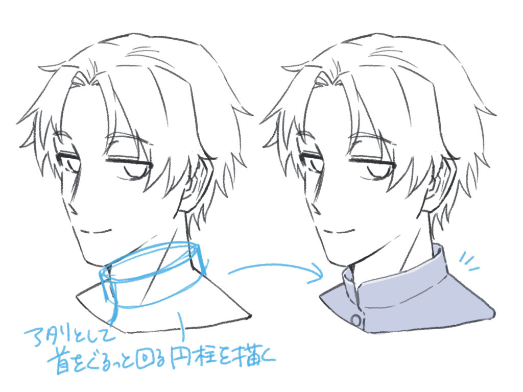 詰襟を描くときは、ぐるっと回る円柱を描くようにアタリを描くと、形を捉えやすくなります。首に沿った詰襟を描いていきましょう。