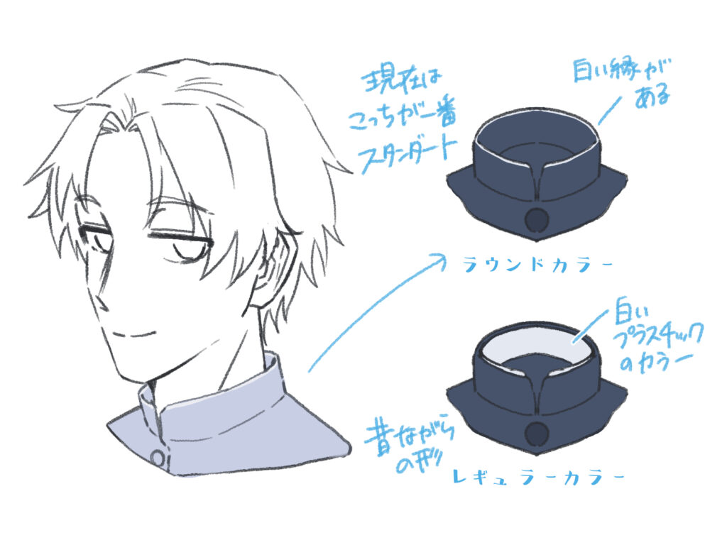 また、詰襟には主に2種類の形があり、キャラクターの設定によって描き分けることができます。
