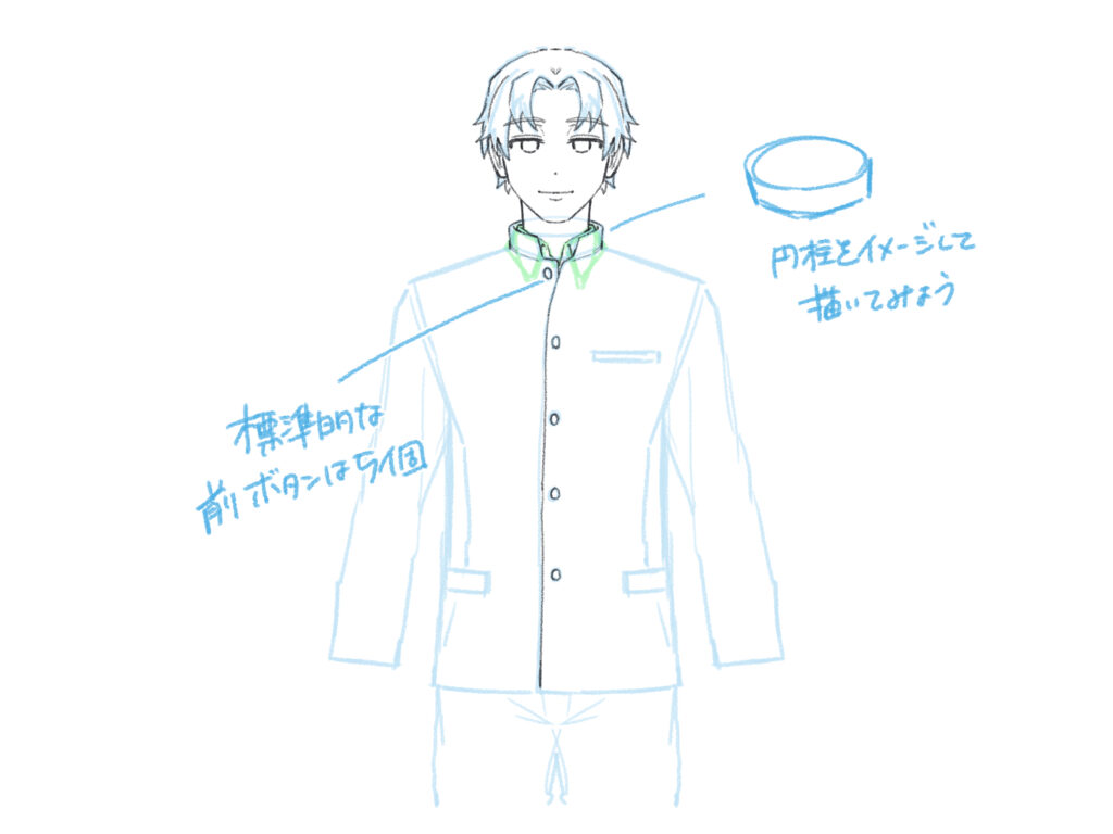 正面・横・後ろ姿が描けるようになれば、斜め向きもぐっと描きやすくなります。襟は常に円柱を意識し、ボタンやポケットといった学ランらしい装飾を描き加えて、学ランを完成させましょう。