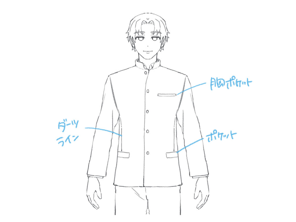 仕上げとして、学ラン全体が描けたら、ポケットやダーツラインなどのディテールを描き足します。学ランはシンプルなデザインだからこそ、こうした細部を描き込むことで、イラストのリアリティがぐっと増します。