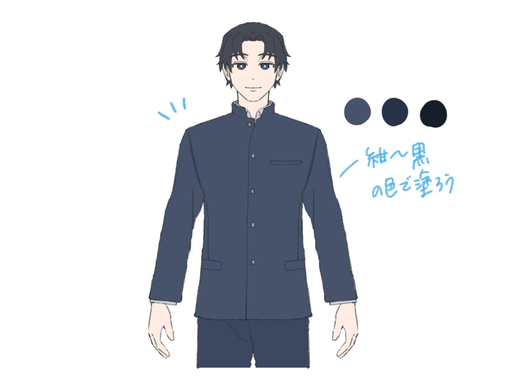 学ランの色は、黒や紺色が基本です。 個人的には、真っ黒で塗りつぶすのではなく、少し青みがかった濃い紺色などで塗ると、光や影の表現がしやすくなるのでオススメです。