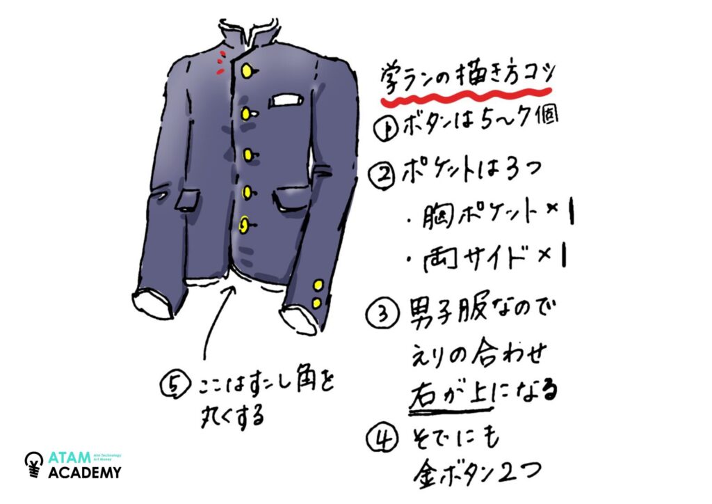 アタムアカデミーでは、学ランの描き方を学ぶことができます。