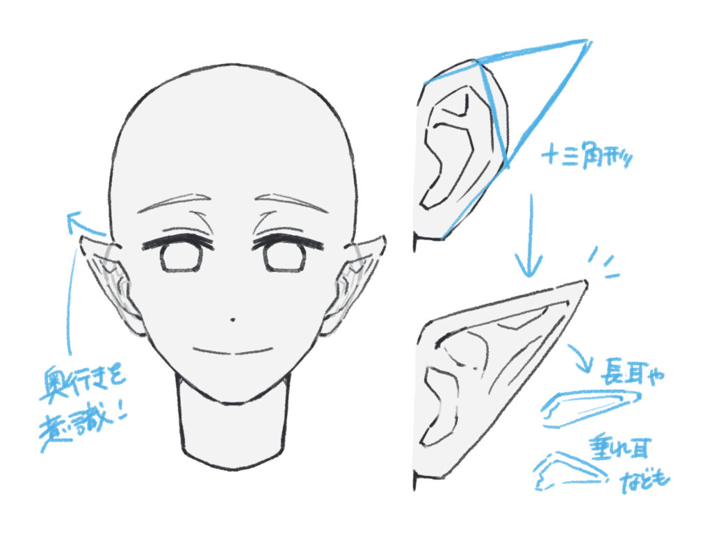 エルフのようなキャラクターを描く際は、人間の耳の形をベースに、先端を尖らせて三角形を足すイメージで描いてみましょう。耳の長さや垂れ具合を変えるだけで、様々な種族や性格を表現できます。