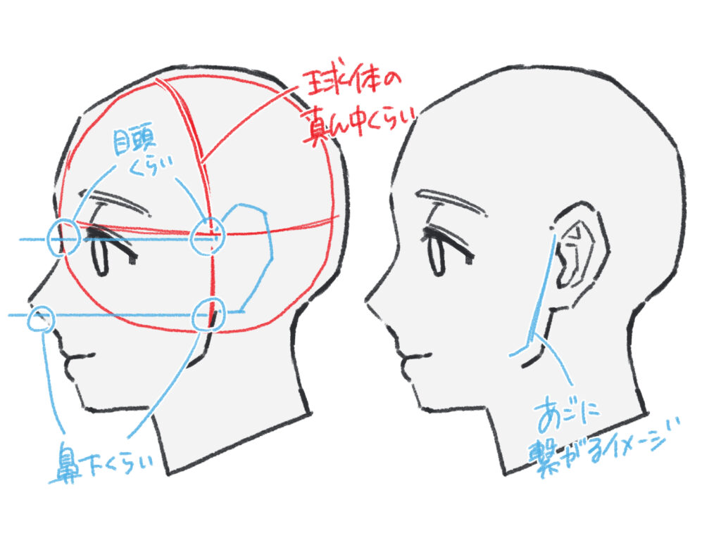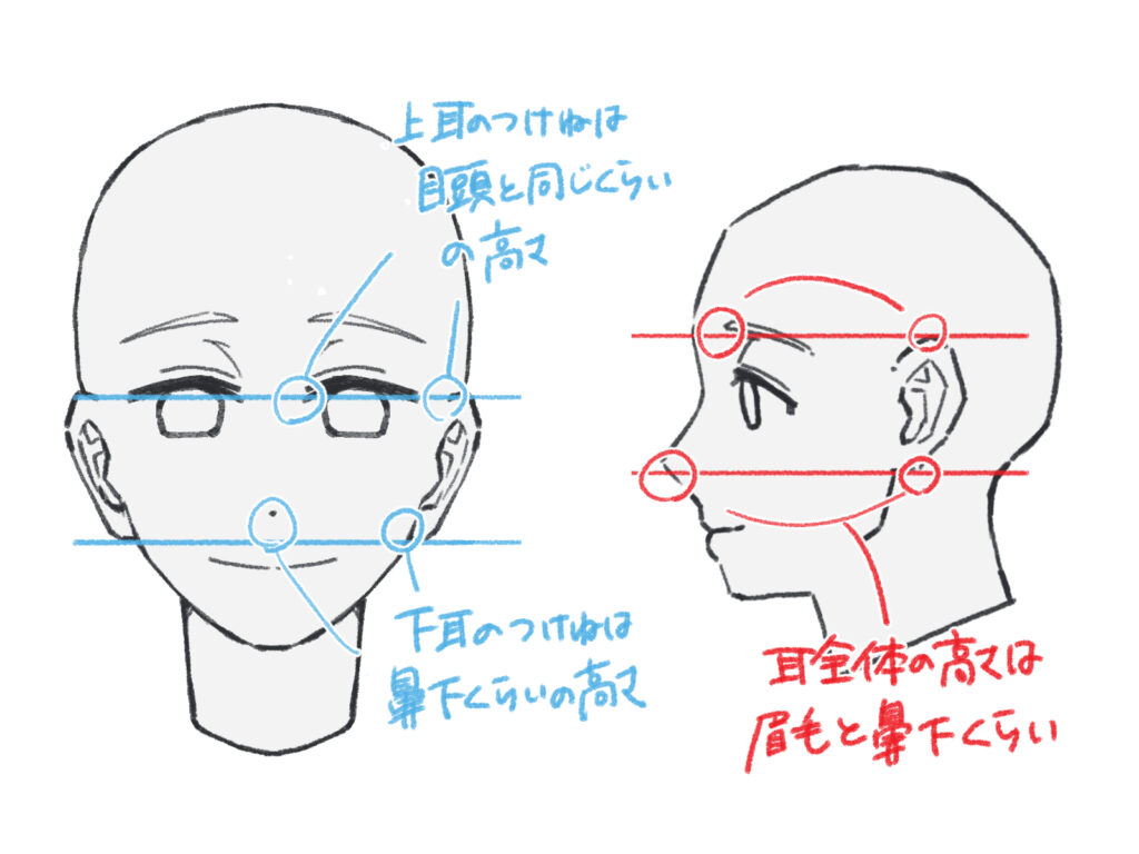 横顔は、これまで解説してきた基本の描き方と同じです。「目」と「鼻下」を基準に付け根の位置を決め、「眉」を基準に高さを決めます。耳の傾きは、フェイスラインや顎のラインと平行になるように描くと自然です。