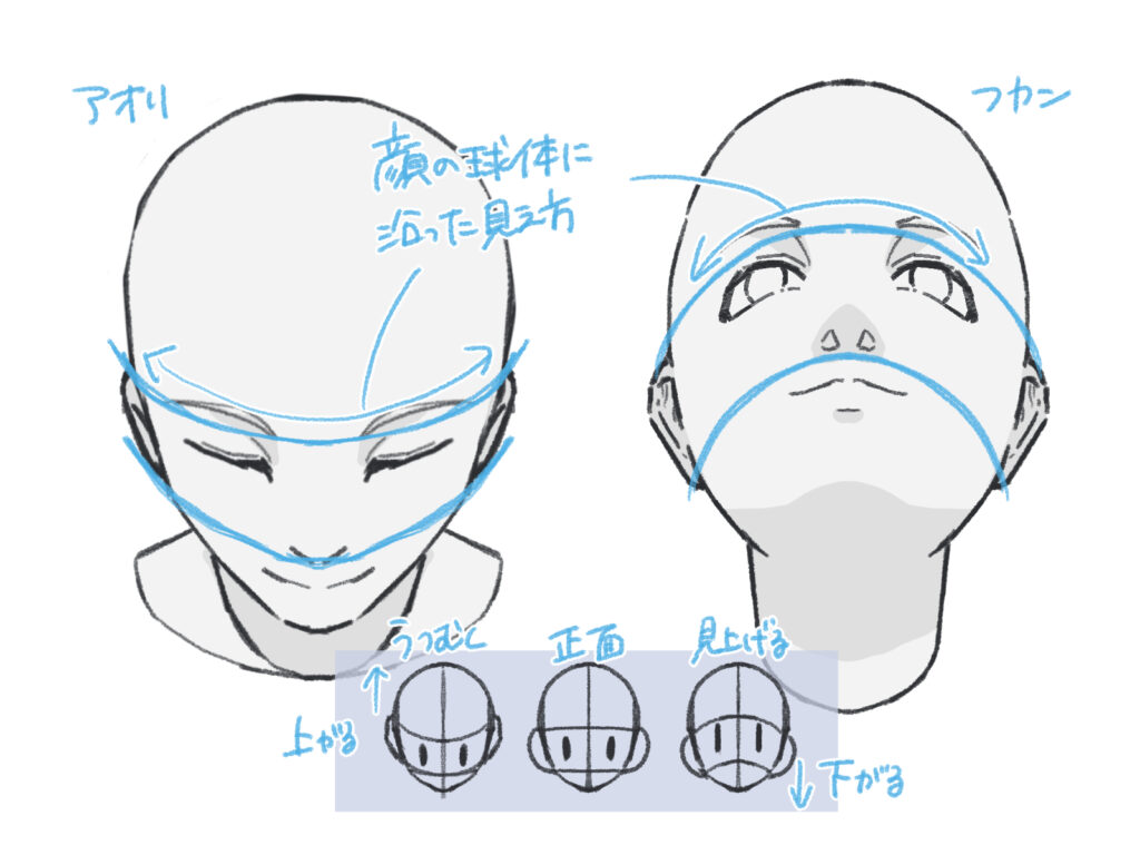 顔の向きが変わっても、この基本ルールは応用できます。顔を立体的な球体として捉え、目の高さ・鼻の下の高さを意識しながら描きましょう。