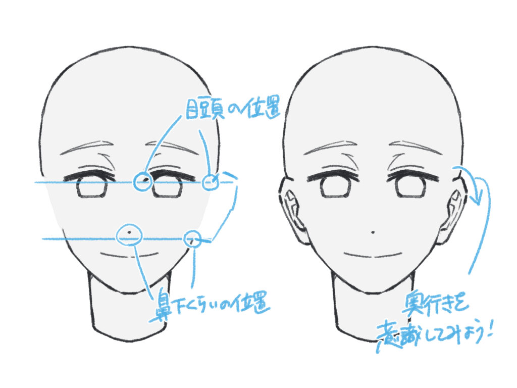 正面から見た場合、耳は少ししか見えません。耳の付け根は「目頭」と「鼻下」の基準を意識しつつ、耳の中は描き込みすぎず、奥行きを感じさせる程度に留めましょう。
