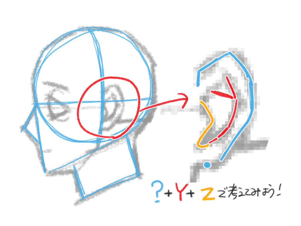 顔という球体に沿って、耳がどのように配置されるかをイメージすることが大切です。