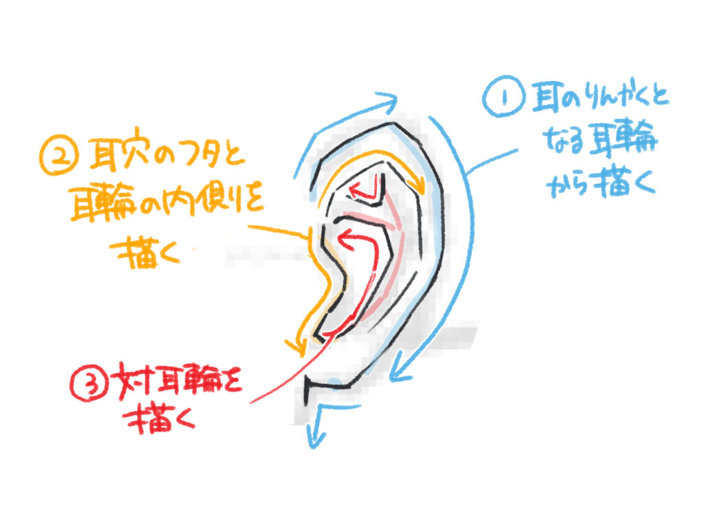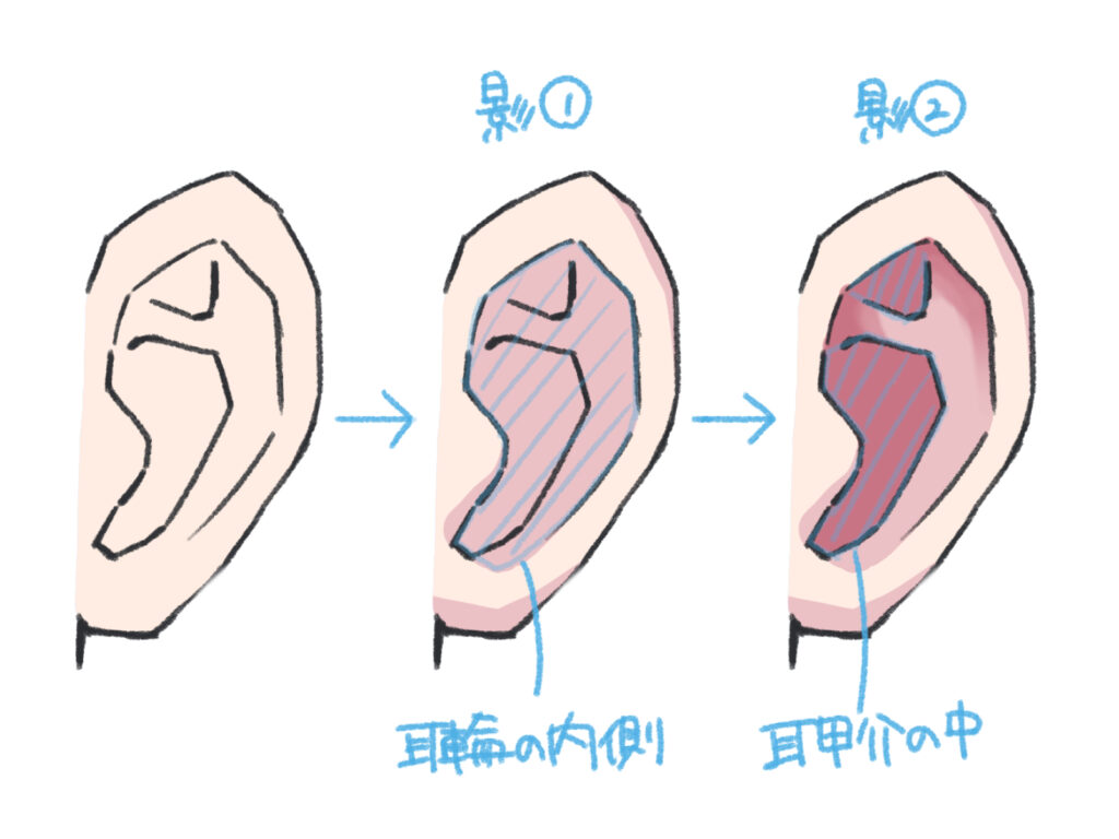 耳の穴とその周りのくぼんだ部分です。イラストでは影になりやすい重要なパーツです。