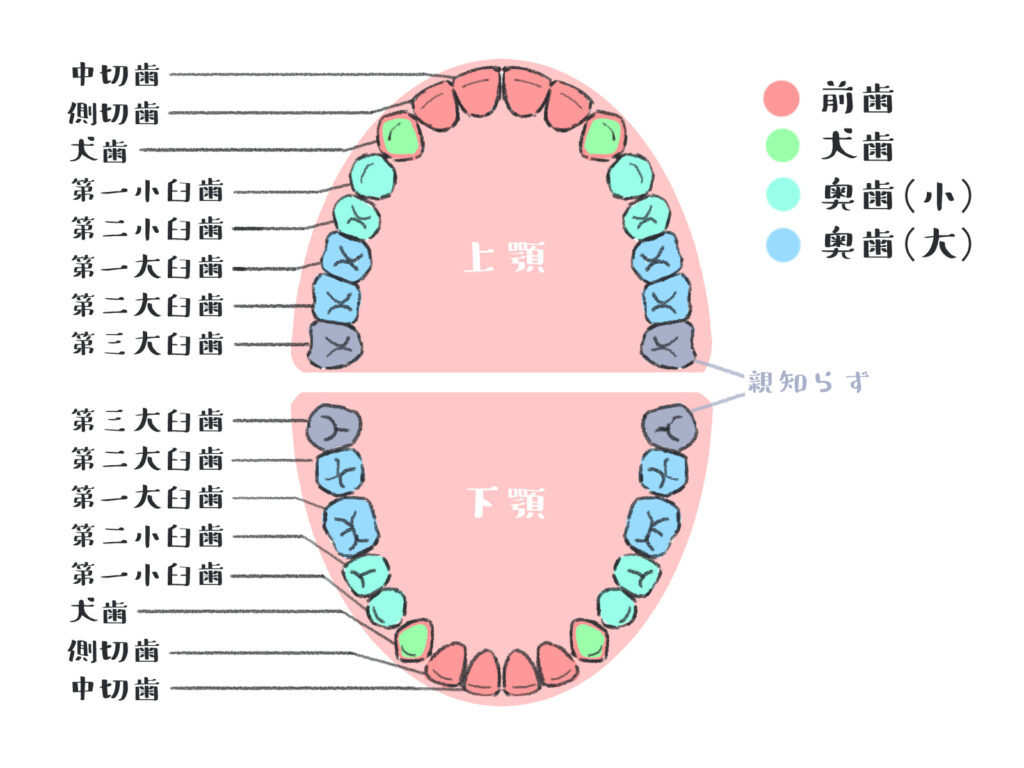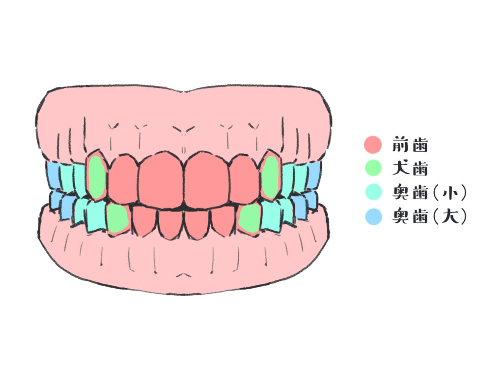 歯は全部で28本(親知らずを含めると32本)あり、それぞれの形状は簡単に3種類に分けられます。