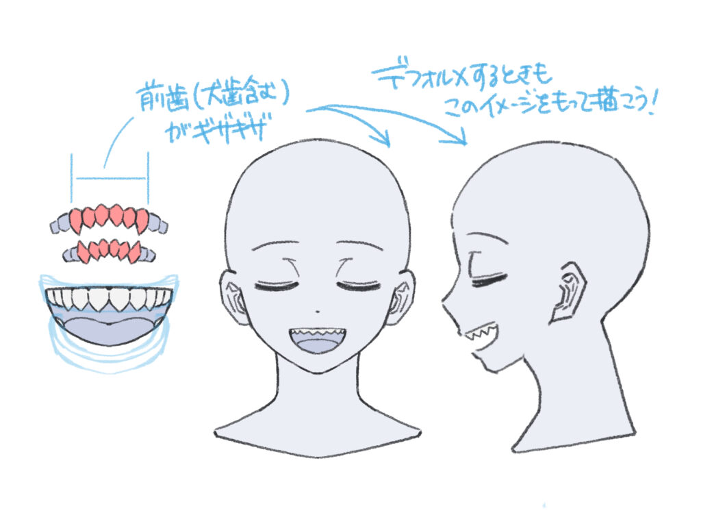 ギザ歯(サメ歯)を描く時は、前歯の部分がギザギザの三角形になるイメージで描きます。奥歯はほんのり尖っている程度で大丈夫です。やんちゃなキャラや人外キャラにオススメです。