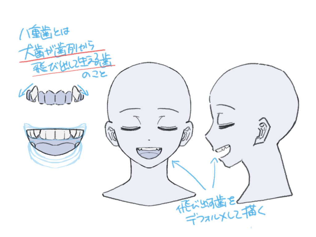 八重歯とは、犬歯が歯列から飛び出して生えている歯のことです。普段の歯並びを描く時に、犬歯だけを少し上(または下)にずらし、他の歯に被さって飛び出しているイメージで描いてみてください。