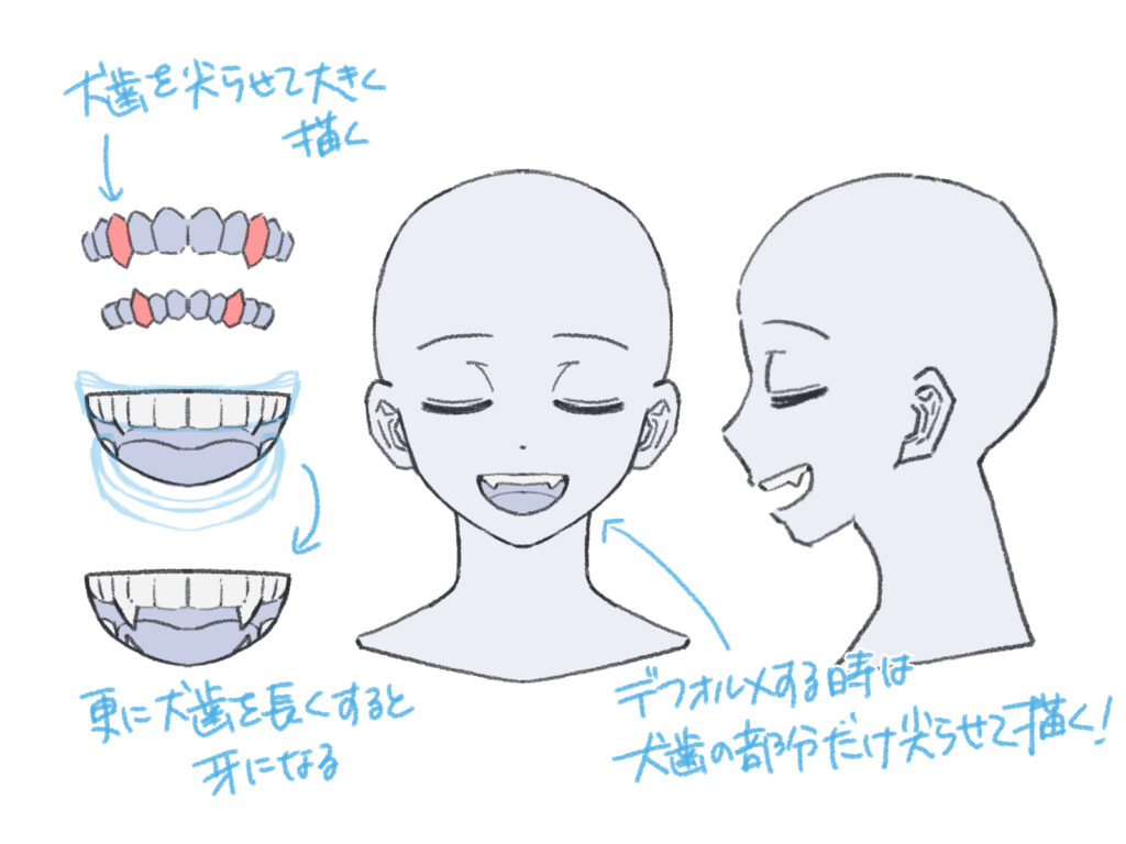 犬歯を普段よりも、鋭く、少し大きく描くと、特徴的な歯になります。獣人など鋭い歯を持つ生き物を擬人化した時などにオススメです。さらに犬歯を長くすることで「牙」のように描くこともできます。