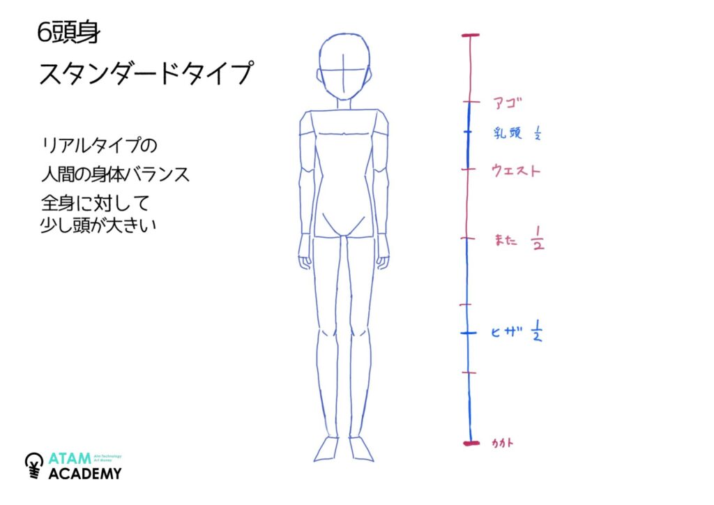 6頭身のバランスを最も簡単につかむための基本的な比率は、頭1:上半身2:下半身3です。