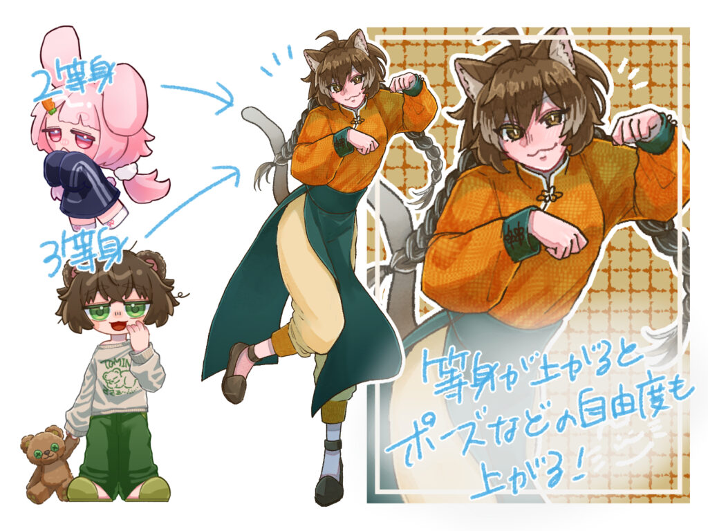 6頭身はデフォルメキャラ(2〜4頭身)と比べて手足が長く、関節の可動域もリアルに近くなります。そのため、簡単なポーズから難しいポーズまで、様々なポージングに挑戦できるのが特徴です。
