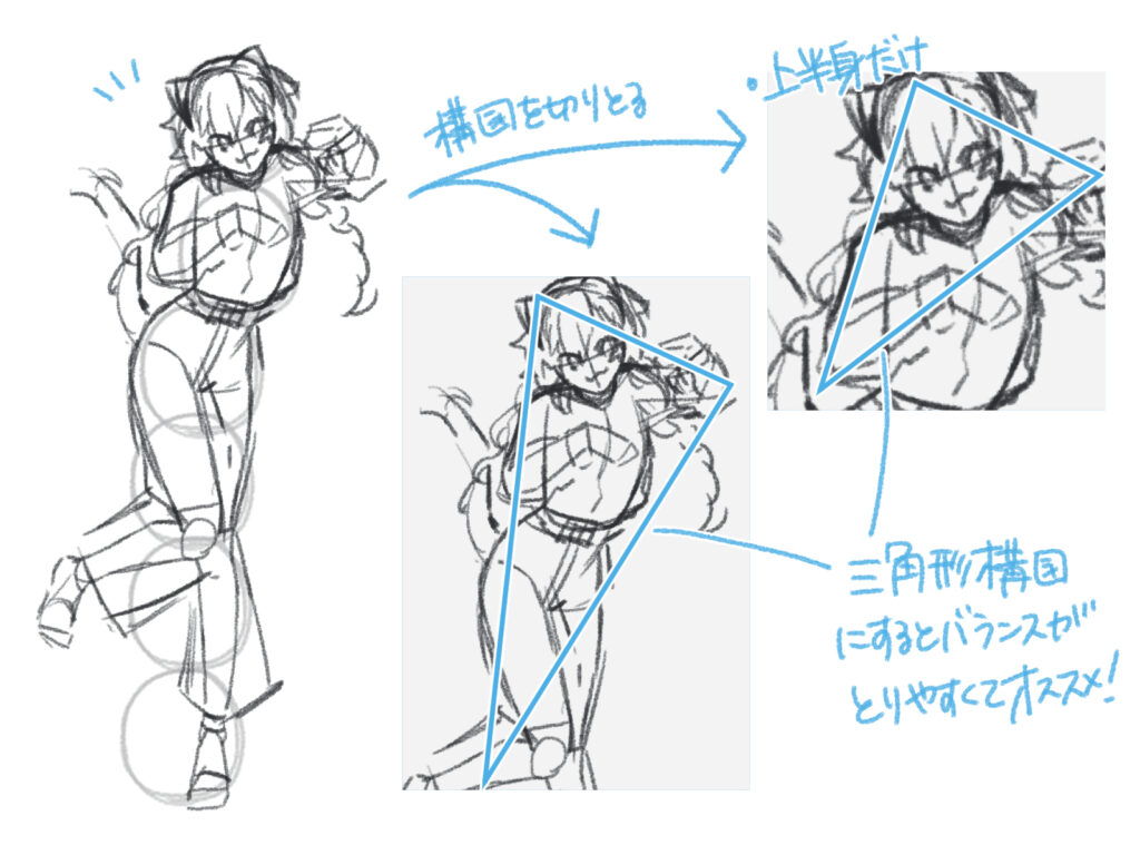 全身イラストを描くとき、構図は非常に重要になります。6頭身キャラクターの場合、三角形構図を意識すると、キャンバス内にバランスよく収めることができます。
