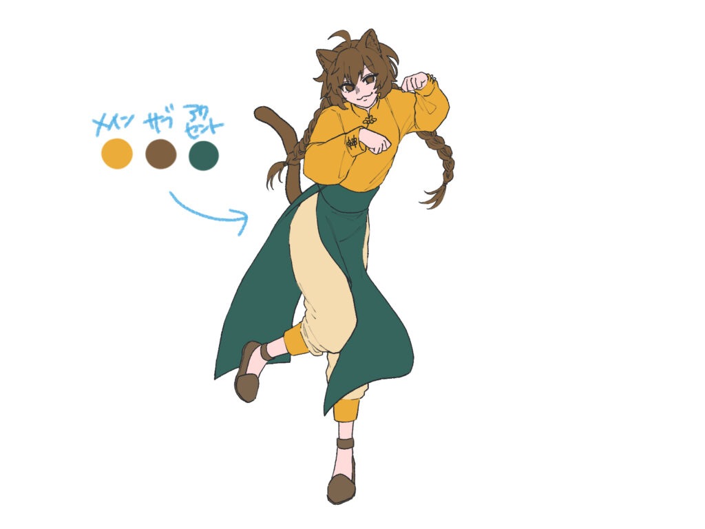 まずはキャラクターの配色を決め、ざっくりと色を置いていきます。 色選びに迷ったら、以下の3色を決めるとまとまりやすくなります。