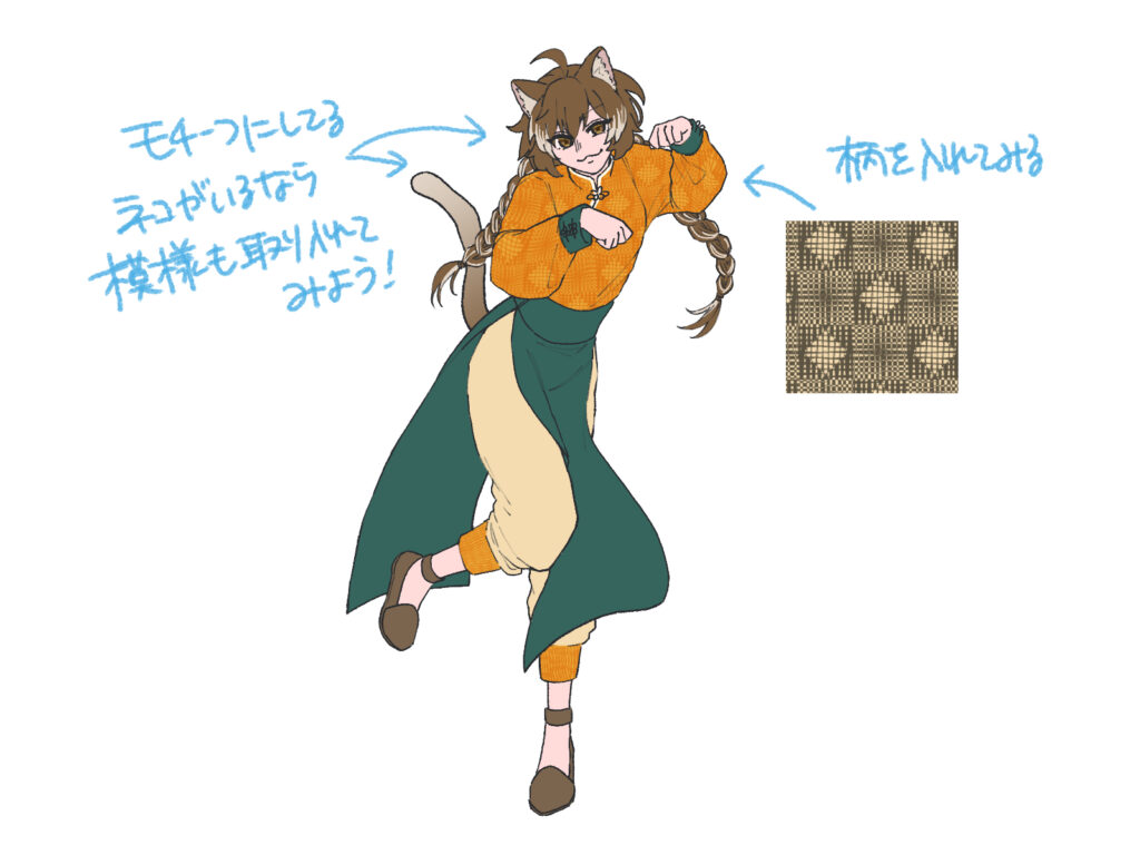 ベースの色が塗れたら、模様などを描き込みます。 テーマにしているモチーフ(今回はチャイナ)があるので、ここで模様として落とし込みます。チャイナ服らしさを出すために、上半身の服に少し複雑な柄を入れてみました。