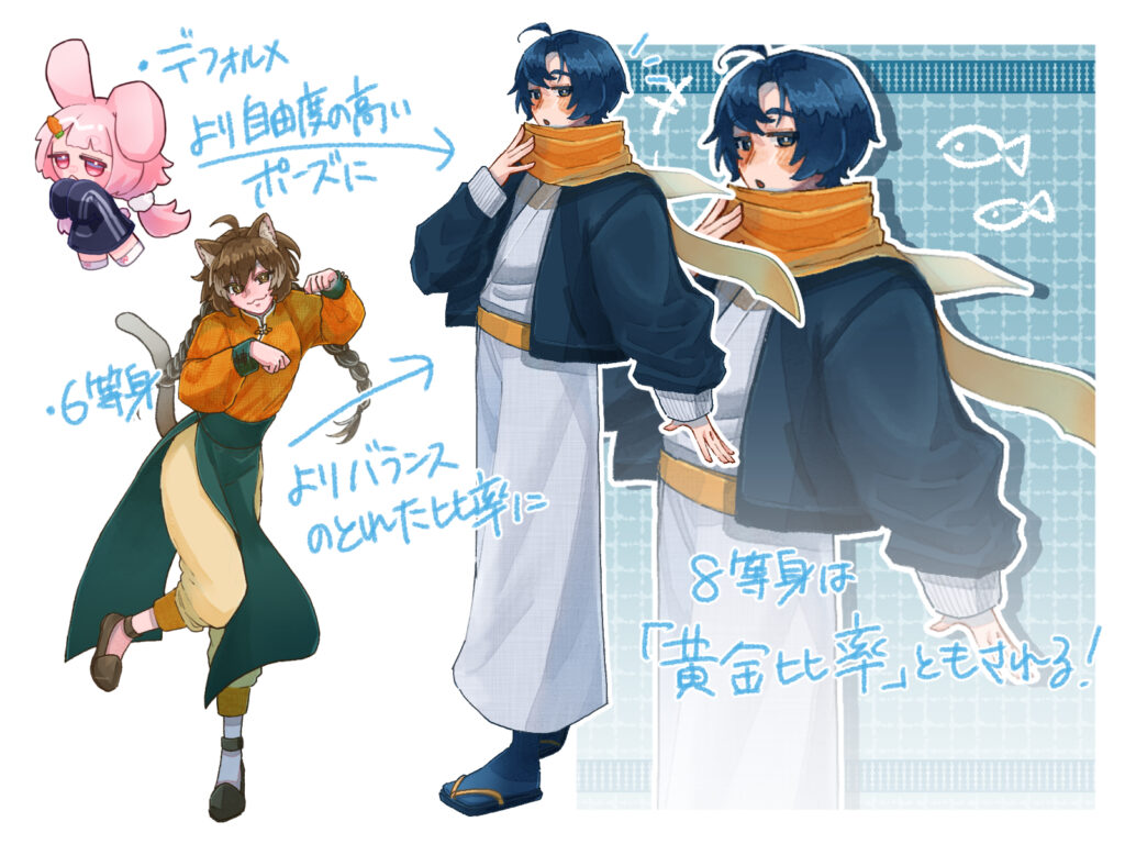 8頭身キャラクターは、スラリとしてバランスが取れており、「黄金比」とも呼ばれる等身です。モデルや芸能人などスタイルがいい人への褒め言葉としても使われます。