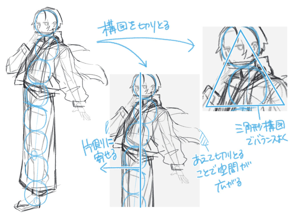 8頭身キャラを描く時は、三角構図や片側に寄せたような二分割構図などがオススメです。