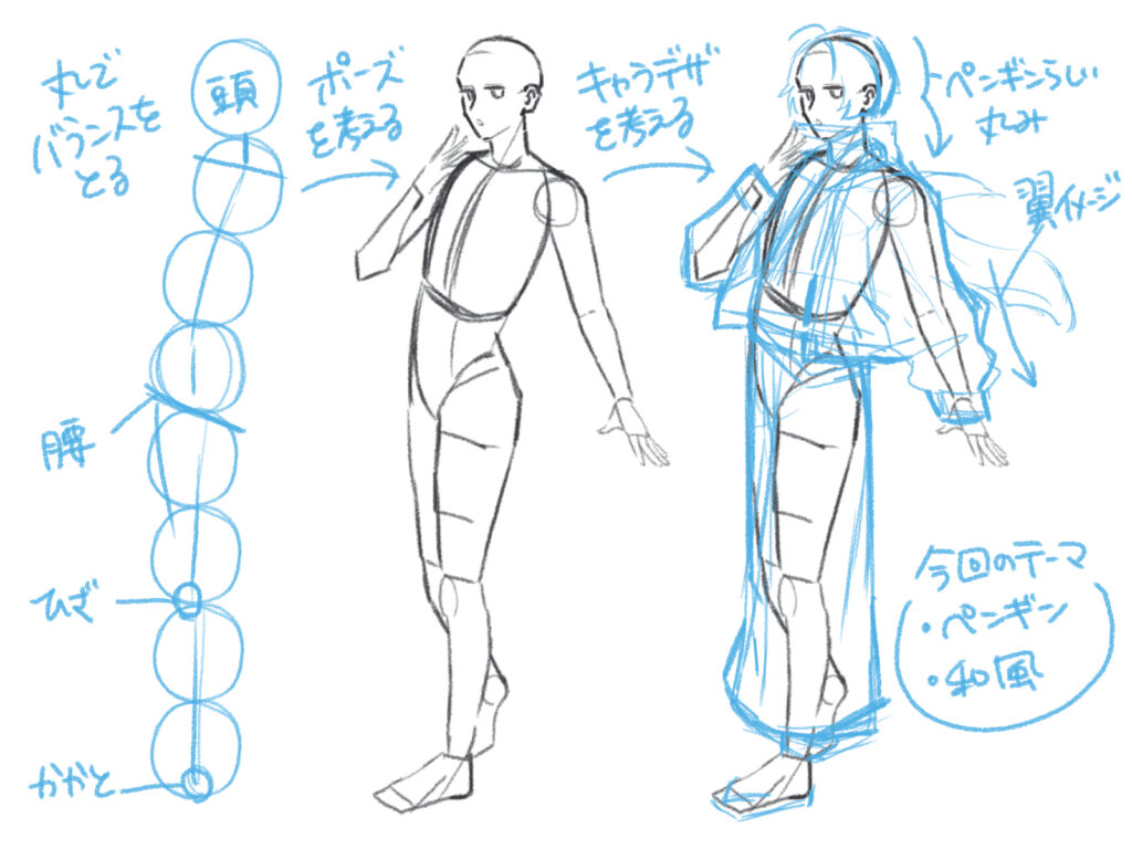 描きたいテーマに合わせてアタリをとっていきます。 今回は「ペンギン」「和風」をテーマに考えていきます。 最初に、簡単な丸を描いてバランスやポーズを確認し、そこからペンギンらしいポーズを考えていきます。 ポーズを考えた後にキャラクターデザインを考えると全体のバランスも見やすいです。