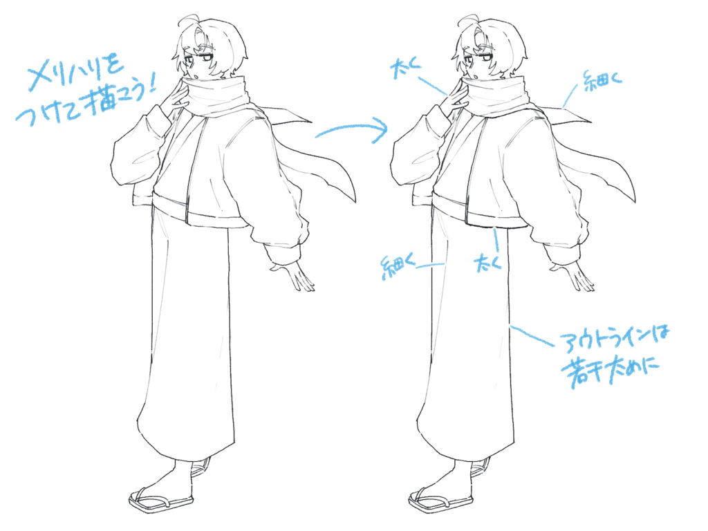 次に、線画を描いていきます。 線画を描くときはメリハリをつけて描いていきましょう。 「手前に来るものは太く、奥にあるものは細く」を意識して描いてみましょう。 キャラクターイラストの場合、アウトライン(輪郭線)を少し太く描くとキャラの存在感が増します。