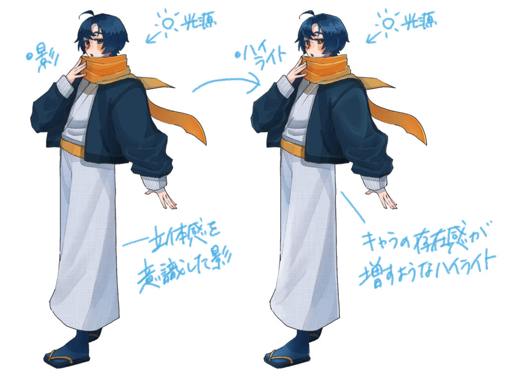 ハイライトを入れるときも、キャラのフチに回り込む光(リムライト)を入れるとキャラの存在感が増すのでオススメです。
