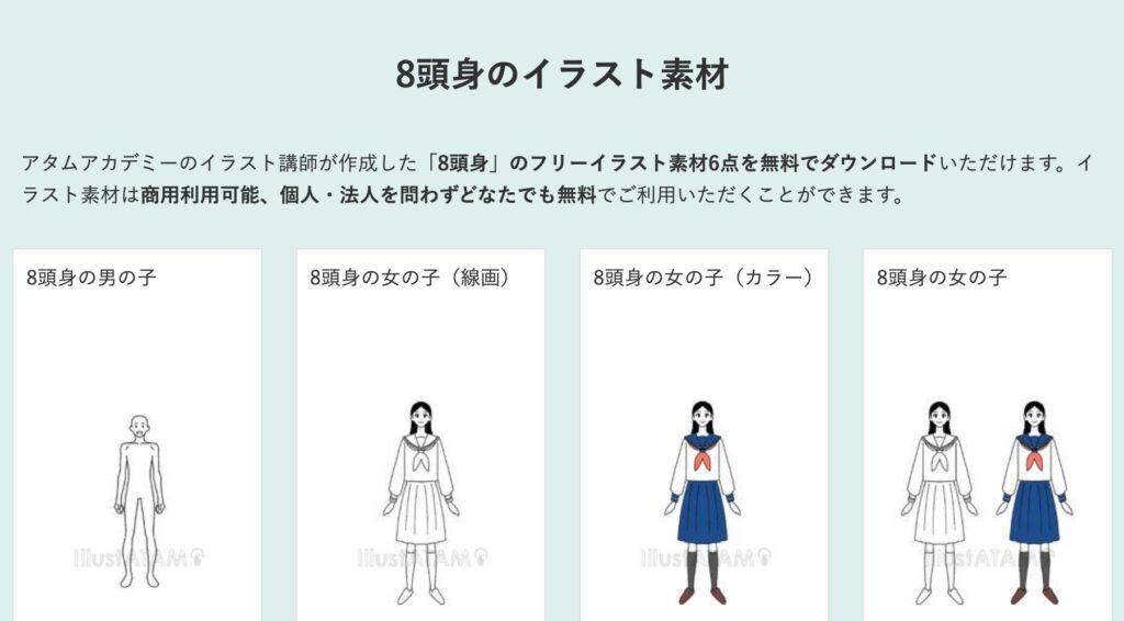 アタムアカデミーでは、8頭身キャラクターの描き方を学ぶことができます。