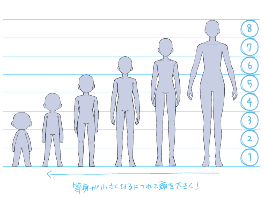 キャラクターを描くときは、頭身の比率を意識しましょう。頭身とは、頭を1としたときに全身が頭何個分あるかを表す比率です。