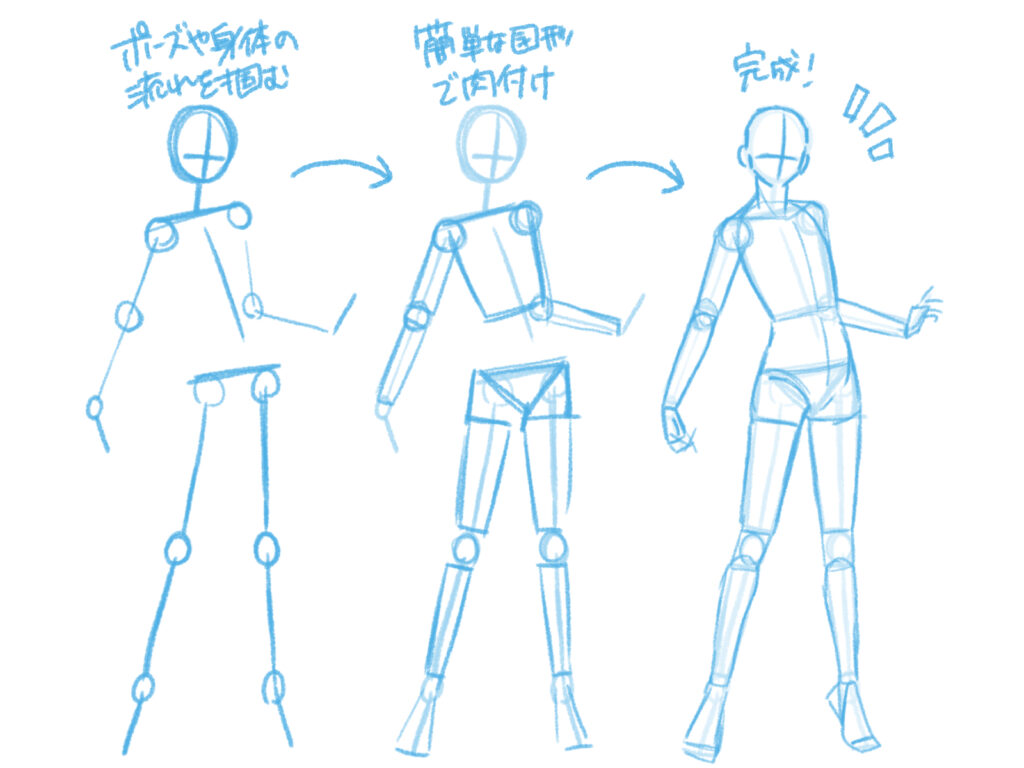 いきなり身体を描くのではなく、棒人間から肉付けして全身を描く方法がおすすめです。
