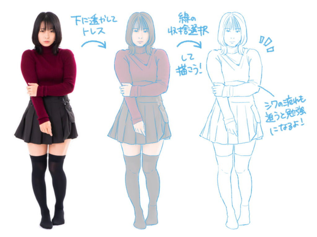 まずは、写真や素材をなぞるトレースで、関節の位置や構造をインプットしましょう。