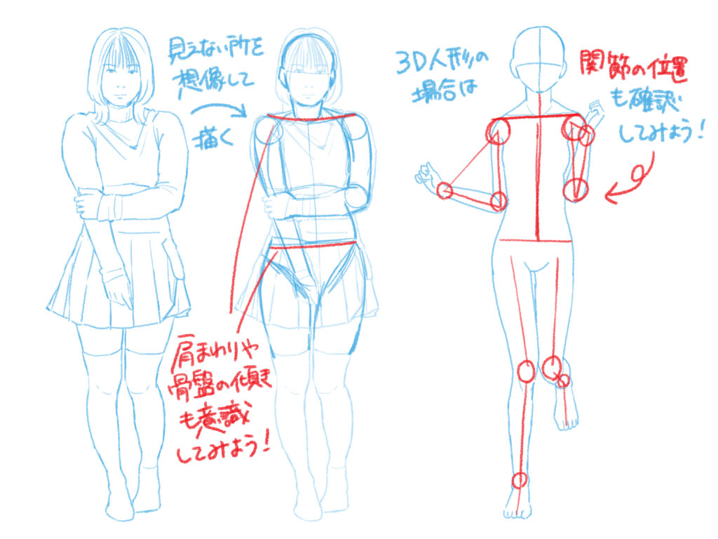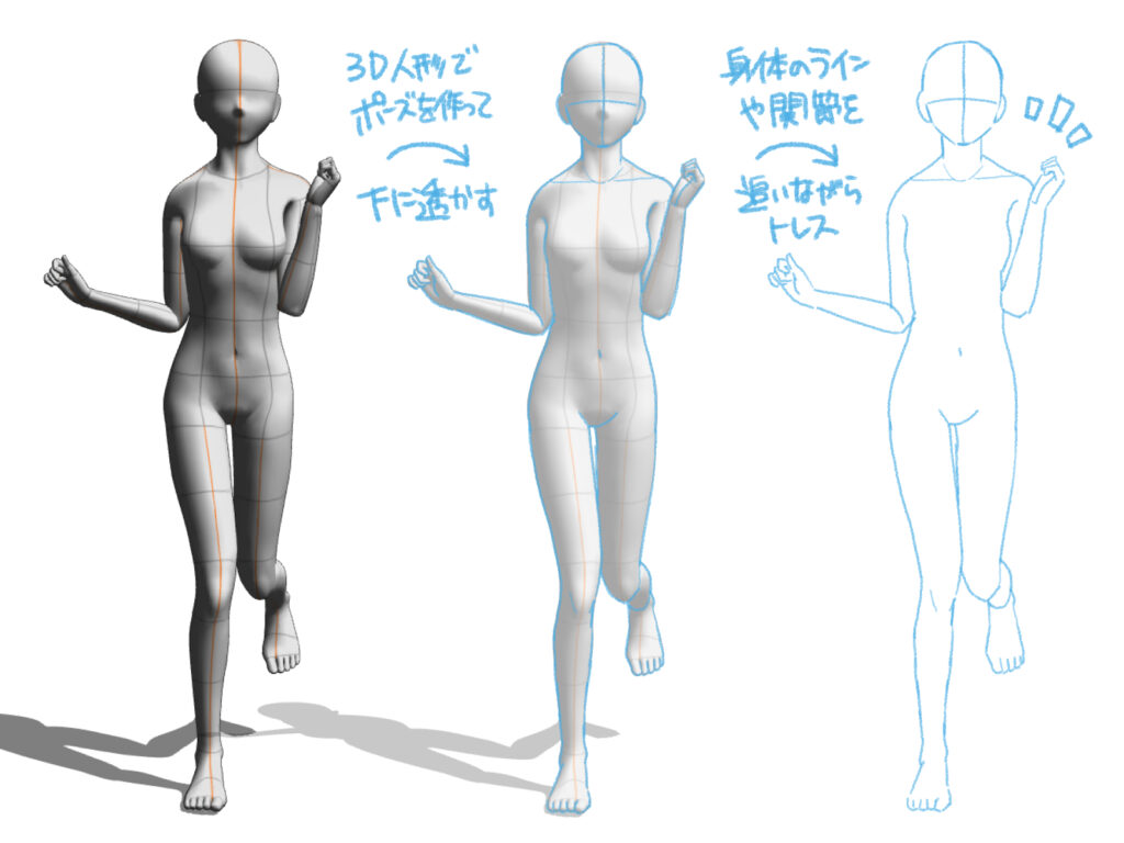 3D人形を使う場合も手順は同じです。参考にしたいポーズを設定したら、以下の点に注目してトレースしてみてください。