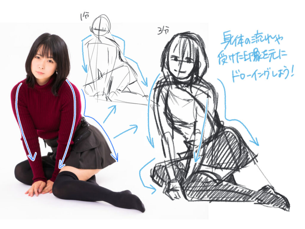 見えない部分を描くことで、身体の構造への理解が深まり、自然なポーズが描けるようになります。