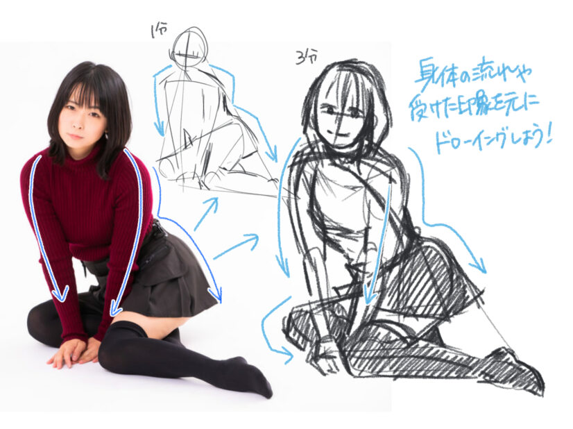 実写の写真やデッサン用3D人形などをトレースして、身体の流れや関節の位置を体感します。