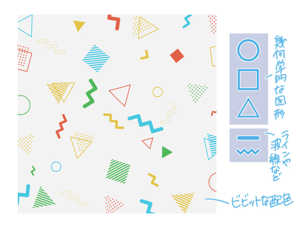 幾何学的な図形(丸・三角・四角)と、直線や波線をランダムに配置することで、メンフィス柄のような賑やかで楽しい印象の背景になります。