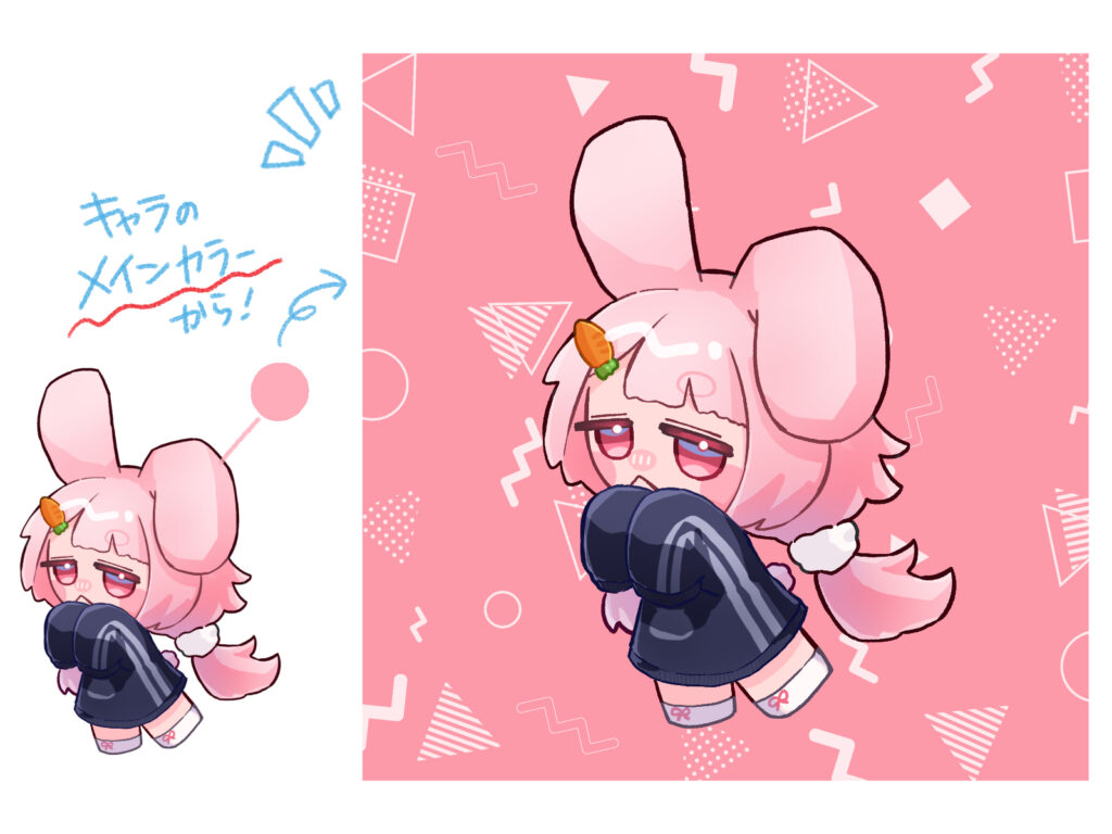 図形の色はビビッドな配色がおすすめですが、キャラクターのテーマカラーから1〜2色とって使うと、全体に統一感が生まれます。