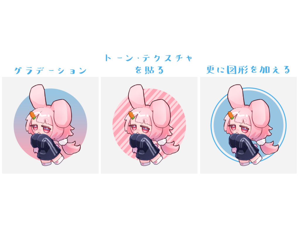 ベタ塗りだけでなく、グラデーションにしたり、トーンやテクスチャを貼ったり、円の周りに小さな丸を付け加えたりと、イラストの雰囲気に合わせてアレンジしてみましょう。