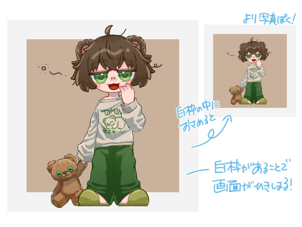 白フチがあるだけで、シンプルながらも意図してデザインされた雰囲気が出せます。内側の色をグラデーションにしたり、テクスチャを貼ったり、さらに細い枠線を追加したりと、応用も簡単です。